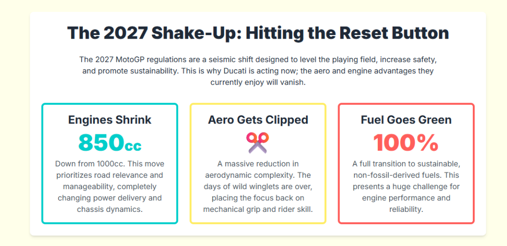 The impending shift in MotoGP regulations mandates that manufacturers design an entirely new machine, requiring a complete conceptual reset that goes far beyond simple component evolution.3 Ducati’s strategic decision to onboard Bulega must be viewed through the lens of this impending technical upheaval.