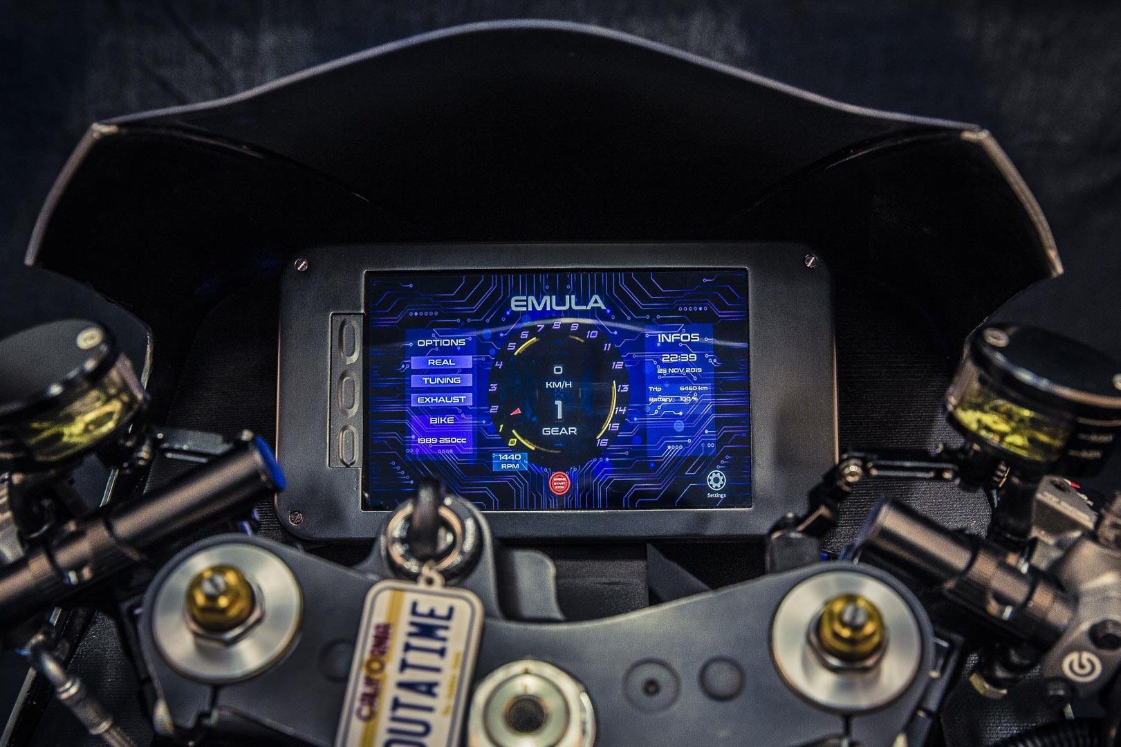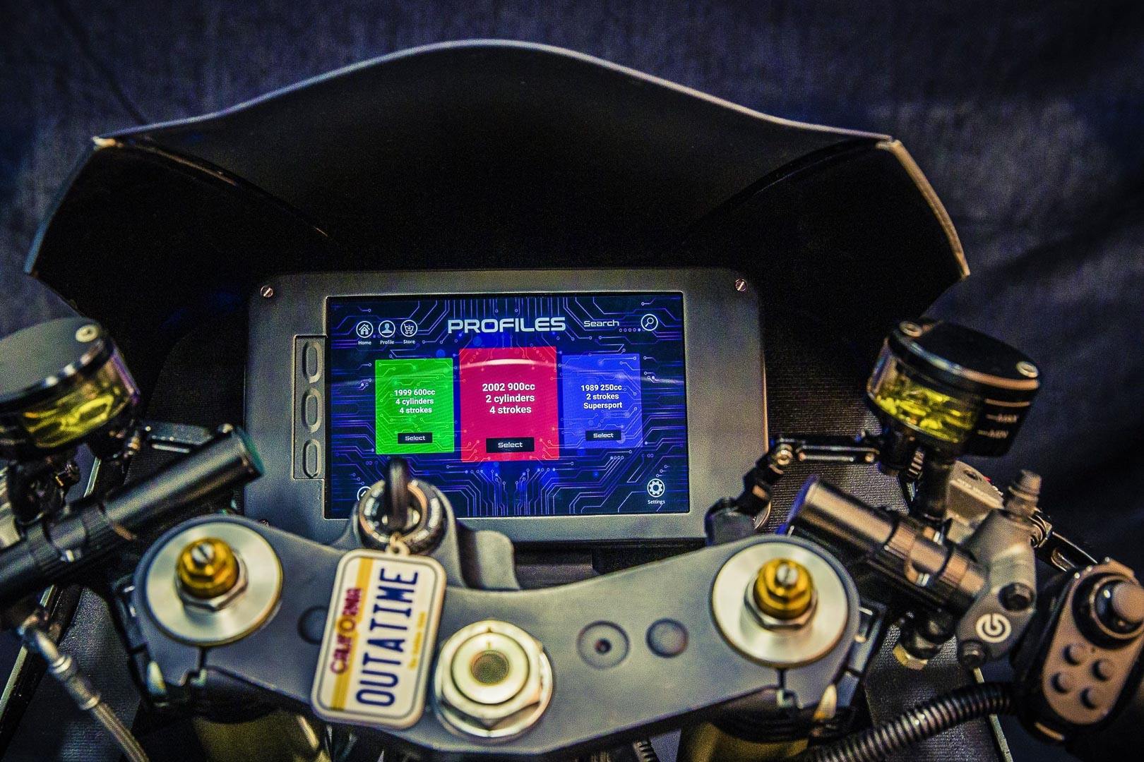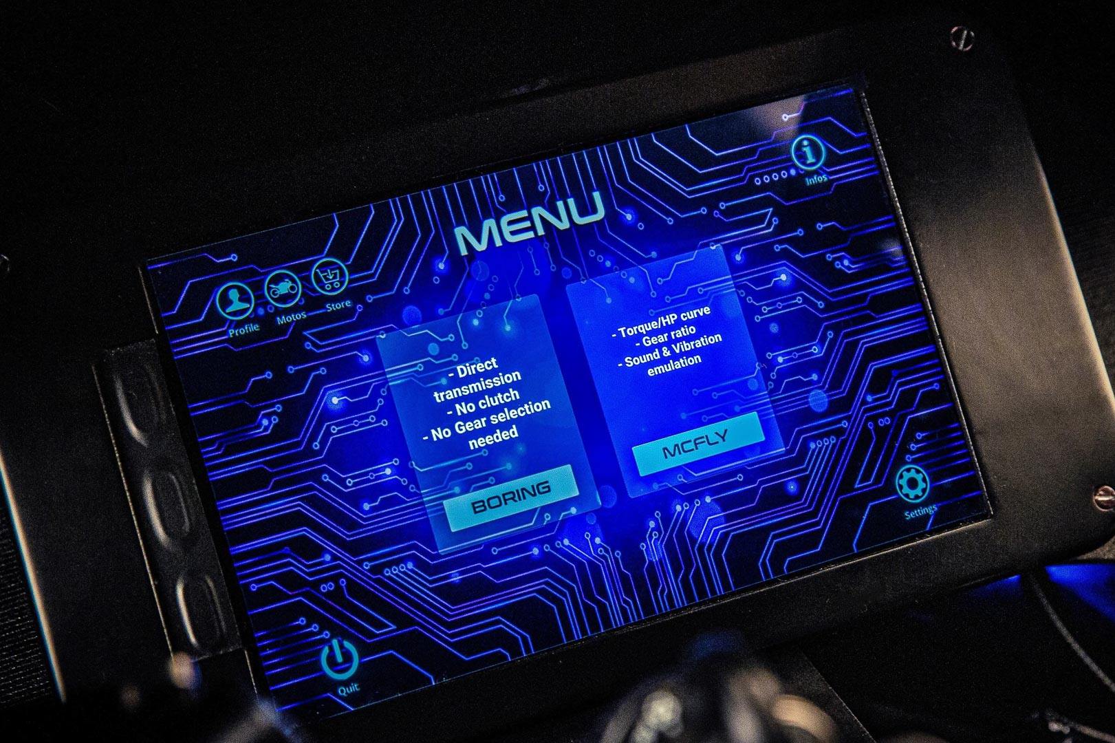 Here the intelligent McFly software alters the response of the electric motor that imitates the different powerplants of the combustion engines of standard motorcycles.