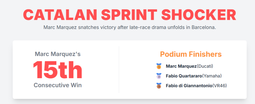 The 2025 Catalan MotoGP Sprint was a landmark event, defined by a dramatic and unexpected turn of fortune that underscored the volatile nature of top-tier motorcycle racing. The race’s central narrative was the continuation of Marc Marquez’s unprecedented win streak, which was extended to 15 consecutive victories across sprints and grand prix. This triumph was a consequence of a critical error by his brother, pole-sitter Álex Márquez, who crashed from a commanding lead with just four laps remaining.