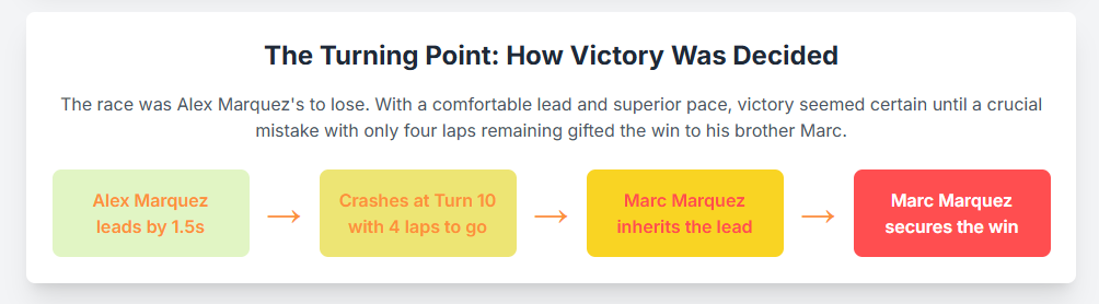 This perception shifted dramatically on lap 9 when Álex Márquez, with a half-second lead and just four laps to go, made a critical error.2 He lost the front of his Desmosedici GP24 at Turn 10, a moment of overconfidence he later described as “completely my mistake”.1 The incident gifted the victory to Marc, who capitalized on the mistake to claim his 15th consecutive win of the season.4 This victory was not a product of superior on-track performance in the moment but rather a testament to Marc’s unwavering presence and ability to maintain pressure even when outpaced. His post-race comments highlighted this psychological dynamic, noting that he had mentally “given up” on the win, and perhaps that moment of relaxation for his brother led to the crash.5 This event demonstrates that in a sport of fine margins, race management and mental resilience can be as decisive as raw pace. Marc’s ability to salvage a win from what seemed like a certain defeat further cements his status as a formidable championship contender.