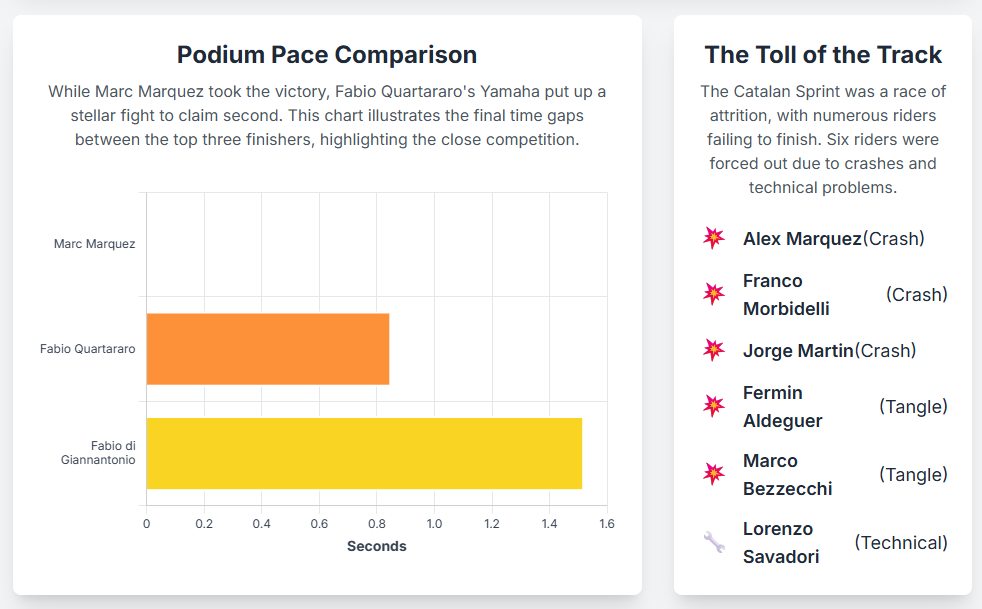 - MotoGP Catalan GP: Marc Marquez inherits sprint win as Alex crashes out of lead, accessed on September 7, 2025, https://www.motorsport.com/motogp/news/motogp-catalan-gp-marc-marquez-inherits-sprint-win-as-alex-crashes-out-of-lead/10757054/