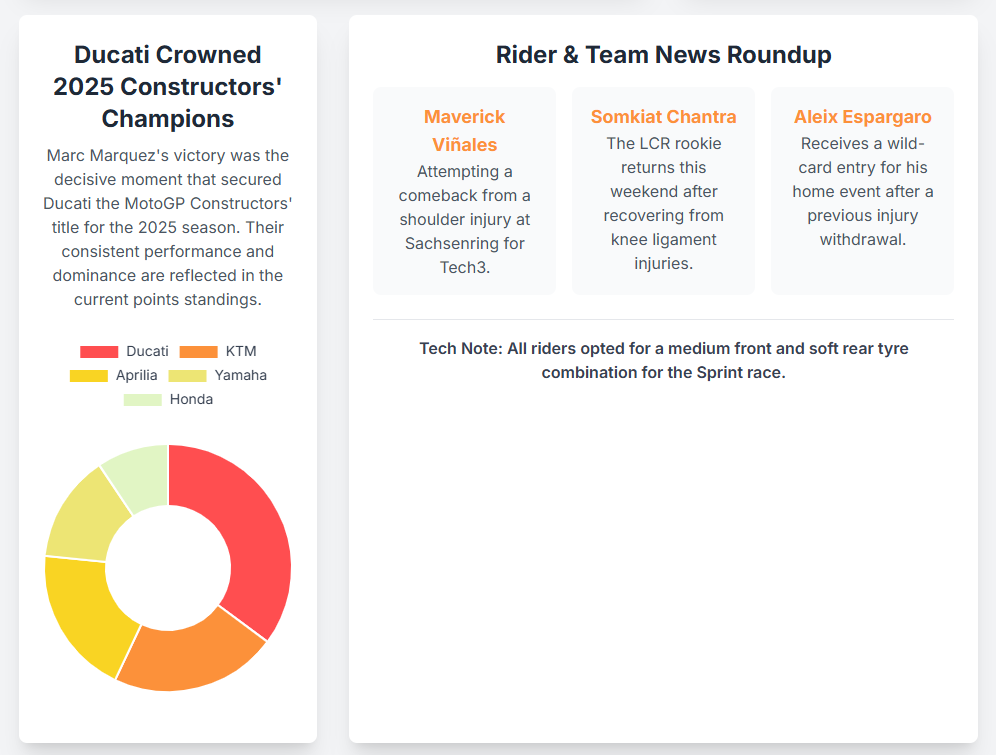 The event also served as the decisive moment for Ducati, which, thanks to the win, clinched its sixth consecutive MotoGP Constructors’ Championship, establishing a new historical record. Beyond the top result, the race featured a standout performance from Fabio Quartararo, who delivered Yamaha its first podium in some time with a hard-fought second place, and a strategic third-place finish for Fabio Di Giannantonio. The race was further punctuated by a series of high-profile incidents and a range of technical factors that offered a comprehensive view of the 2025 season’s competitive dynamics. This report provides a comprehensive analysis of these key events, examining the performances, technical choices, and long-term implications for the championship.