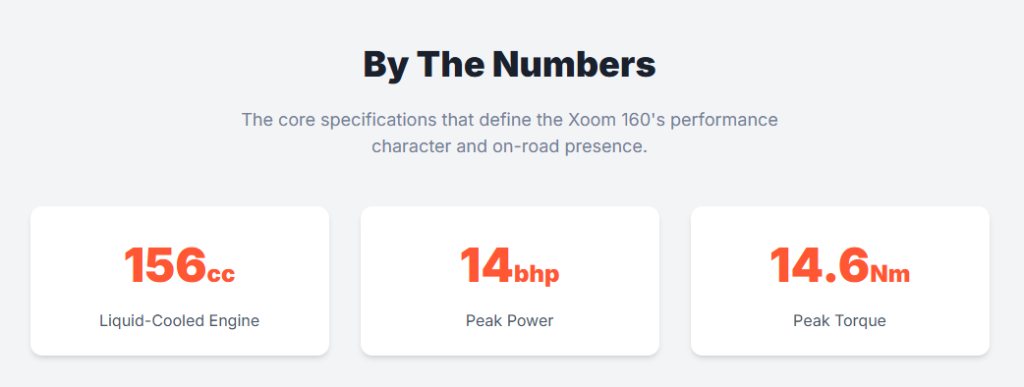 The scooter’s performance is characterized by its smooth and eager nature, particularly in its optimal operating range. While its power figures may not seem “jaw-dropping” on paper, the scooter feels “surprisingly eager” on the road.1 Its engine is most responsive and “comes alive” at mid-range speeds, specifically between 45 kmph and 70 kmph. This is the scooter’s “sweet spot,” where it feels perky and responsive, making it a pleasure for cruising and for brisk overtaking maneuvers in city and suburban environments.4 The Xoom 160 demonstrates commendable highway cruising ability, capable of holding a steady 90-100 kmph with ease and even pushing into triple digits without vibrations.1 This capability lends it “strong highway credentials”.7