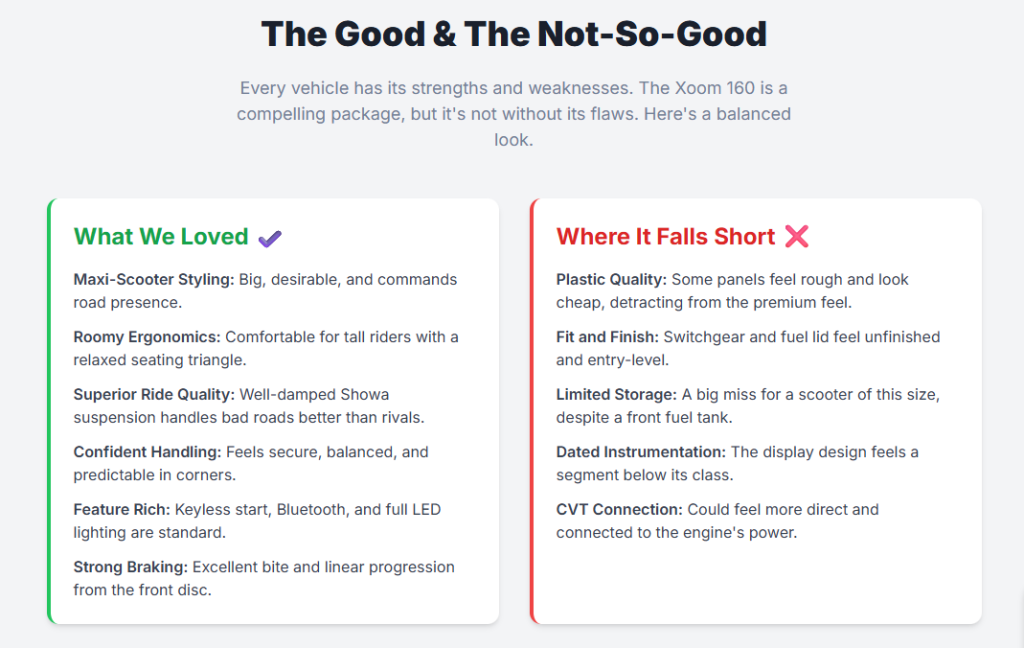 Based on extensive professional and user reviews, the Xoom 160 is a well-rounded and highly capable package. It successfully integrates a muscular, motorcycle-like aesthetic with a composed and mature ride experience, making it a viable option for both daily commuting and weekend touring.1 The scooter’s primary strengths lie in its refined mid-range engine performance, its exceptional stability on highways, and a feature set that adds significant value for its price point. However, the analysis also reveals certain compromises that prevent it from achieving a flawless status. Noted drawbacks include a stiff suspension system, tires that lack confidence-inspiring grip, and some inconsistencies in build quality and ergonomics.4 These factors lead to the conclusion that while the Xoom 160 is a major step forward, it remains a “work in progress”.4