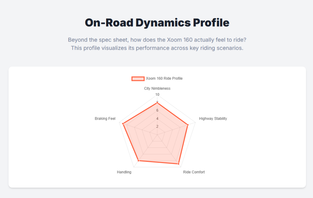This stiffness, while detrimental to city comfort, is instrumental in the scooter’s on-road stability. The Xoom 160 is noted for feeling “solid and planted” at highway speeds, holding its line with impressive poise through fast corners.1 Its handling in the city is a mix of its strengths and weaknesses; while its weight feels balanced and steering has the right amount of heft to feel secure, its overall size and weight make it less nimble than other scooters in its class.4