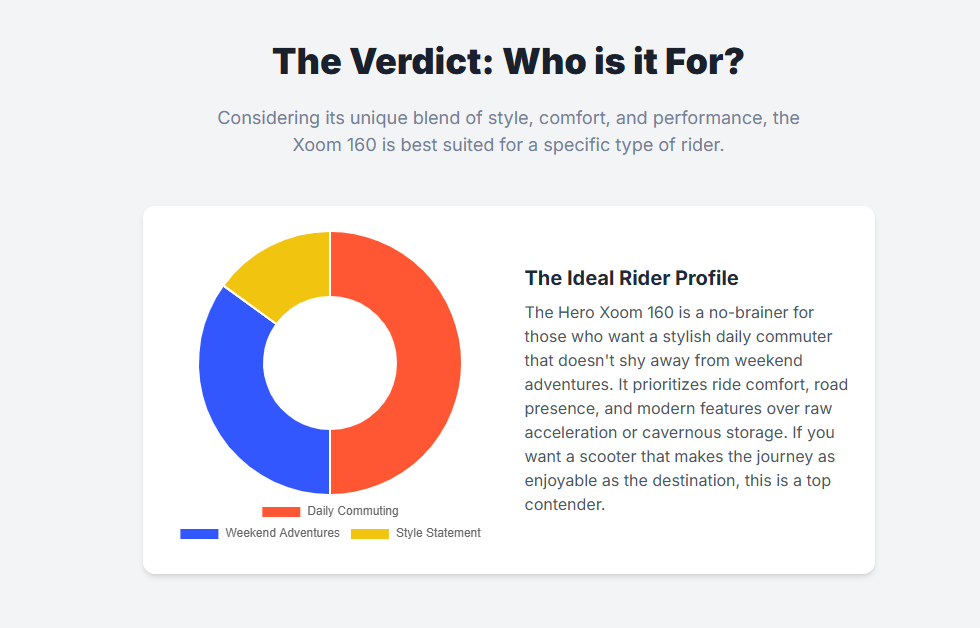 The Hero Xoom 160 is a versatile machine that is best suited for a specific demographic of riders. The ideal rider is a discerning individual who requires a practical vehicle for daily urban commuting but also values a motorcycle-like riding experience for occasional weekend tours. This rider is drawn to the scooter’s muscular and eye-catching design, appreciating its confident highway performance and stability.1 The Xoom 160 is also an excellent option for the price-conscious consumer who seeks a premium-looking scooter but finds the high price points of rivals prohibitive. Its generous storage capacity, long riding range, and comprehensive feature set make it a highly practical and appealing package.3