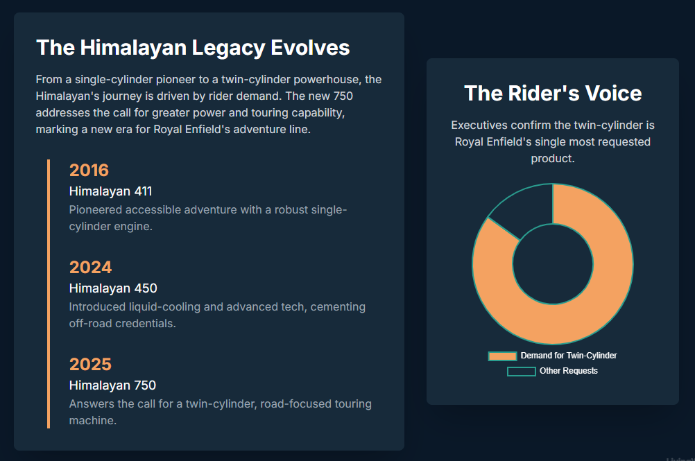 Despite the considerable success of the 411cc and 450cc Himalayan models, a consistent and pronounced demand has emerged from the customer base for a more powerful, twin-cylinder adventure machine.4 Mark Wells, Royal Enfield’s Global Head of Product Strategy, has explicitly acknowledged this, stating that a “Himalayan twin is without a shadow of a doubt, our most asked-for product”.4 This demand is driven by riders seeking superior highway performance, reduced rider fatigue on extended tours, and the ability to compete more effectively with larger displacement adventure motorcycles in diverse riding conditions.8
