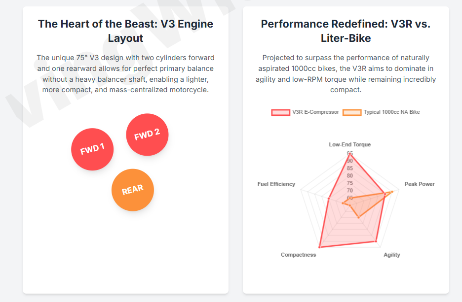 At its core, the V3 engine concept features a unique “75-degree V configuration, three-cylinder unit” with “two cylinders face forward with the third facing back”.1 This unconventional layout is engineered to be “extremely compact and slim” 2, a critical attribute for motorcycle design. This inherent compactness is not merely about fitting the engine into a frame; it is a fundamental design choice that allows for a “high degree of latitude” in the motorcycle’s overall layout, enabling engineers to “focus on creating a more centralised mass”.1 A centralized mass is a major factor in achieving exceptional handling qualities, which are paramount for any high-performance motorcycle. The flexible placement of the electric compressor, which does not require an intercooler, further supports this compact and mass-centralized design.1