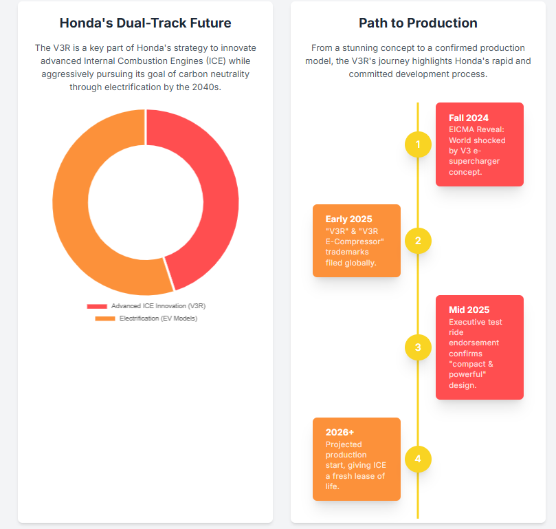 Regarding a production timeline, industry speculation suggests a full unveiling of the complete motorcycle could occur later in 2025, with production potentially commencing by early 2026.11 The high anticipation is evident in some reports prematurely announcing a “2025 Honda RC-V3R”.18 This timeline aligns with Honda’s broader vision that the electric compressor-fed V3 “will also give the internal combustion engine a fresh lease of life in 2026 and beyond”.1