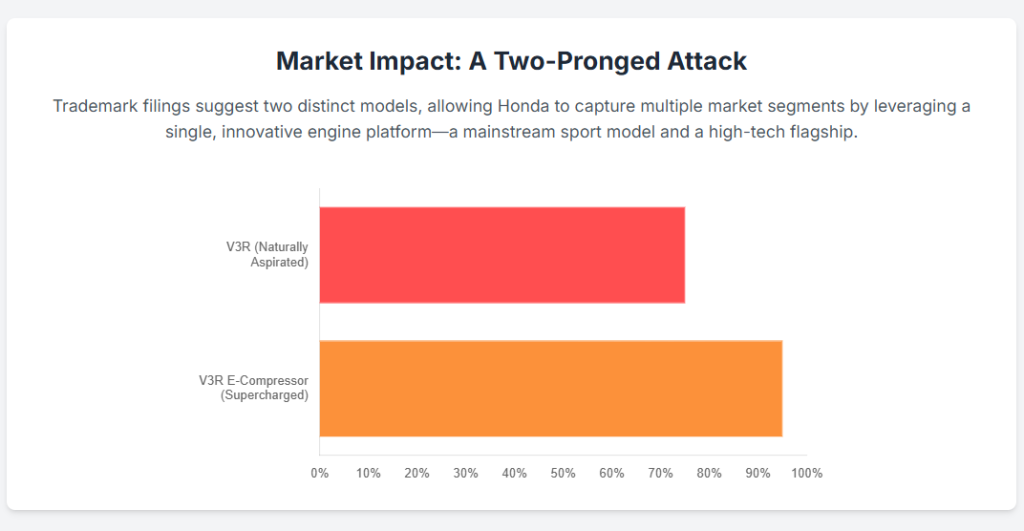 The existence of two distinct trademarks—”V3R” and “V3R E-Compressor”—strongly suggests a potential dual-variant product strategy. It is plausible that the “V3R” (without the “E-Compressor” suffix) could denote a “normally aspirated (fuel-injected) version of the concept,” while the “V3R E-Compressor” would be the technologically advanced, electrically supercharged variant.7 This approach allows Honda to maximize the return on its significant V3 engine development investment by catering to different market segments or price points. By offering both versions, Honda can provide a more accessible entry into the V3 platform while simultaneously showcasing its cutting-edge forced induction technology. This strategic flexibility enables Honda to efficiently dilute development costs by leveraging the core engine platform across “multiple machines”.13