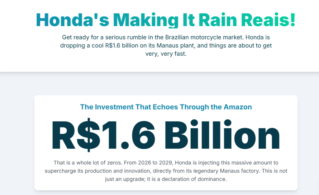 Honda’s commitment to invest approximately 1.6 billion reais into its Manaus motorcycle plant over four years (2026–2029) stands as one of the most significant capital deployments in the Brazilian automotive sector in recent history.1 This investment is fundamentally a dual-strategy commitment: it is a necessary, immediate action to secure production volume in an intensely growing market, and simultaneously, it acts as a preemptive operational defense against aggressive new competitors who are rapidly fracturing the established market structure.