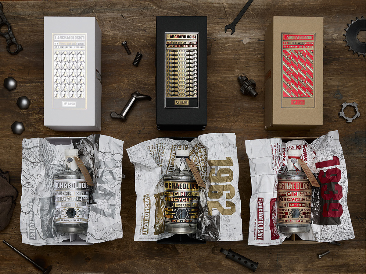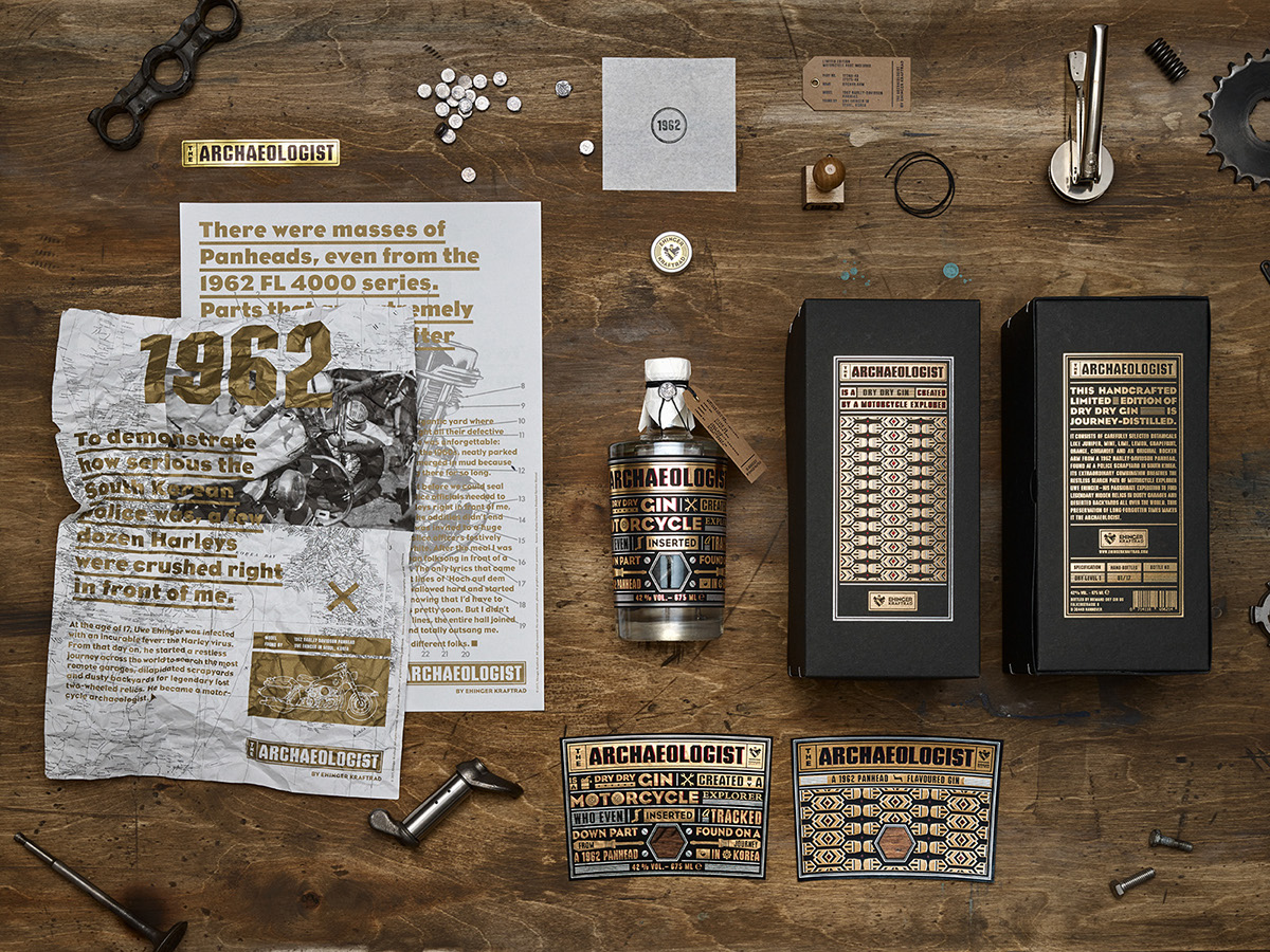 The Product Design and Packaging Design of the Premium Dry Gin “The Archaeologist “is the first spirit of its kind. Thus, it’s filled in bottles together with original engine parts of legendary Harley Davidson bikes.