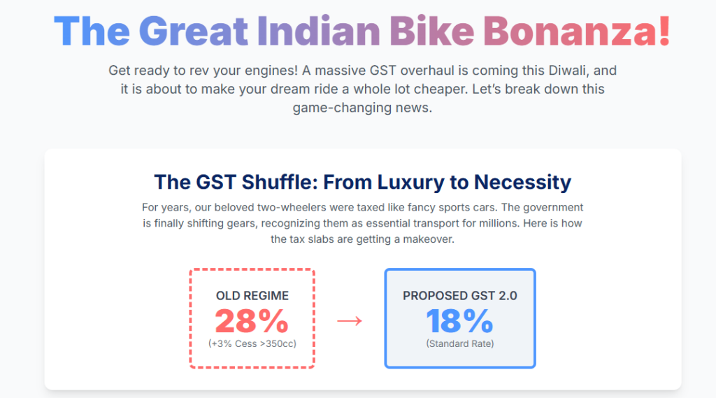 The Indian government is reportedly preparing a deep-dive overhaul of its indirect tax framework, a grand initiative being hailed as “GST 2.0”.1 Prime Minister Narendra Modi himself referred to the coming reforms during a recent address, calling them a “Diwali gift” for the people of the country.4 This is not a simple rate adjustment; it is a strategic government gambit to reboot an entire industry and, by extension, stimulate the national economy. The proposed reform, which would significantly reduce the tax burden on two-wheelers, is the catalyst the automotive sector has long been waiting for, promising to make personal mobility more affordable as the festive season approaches.6