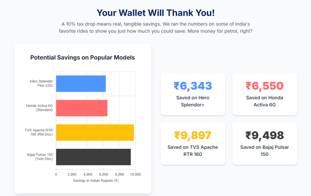 The proposed GST reduction is not just an abstract policy change; it translates into tangible savings for the consumer. The shift from a 28 percent to an 18 percent GST rate could result in savings of up to 5-10 percent on the overall vehicle cost.4 For the entry-level and mass-market two-wheelers that are the backbone of the Indian market, this reduction could bring about a significant price drop. To illustrate the impact, a simple calculation on the ex-showroom price shows how a reduction in the tax component can create a noticeable difference in the final price tag.