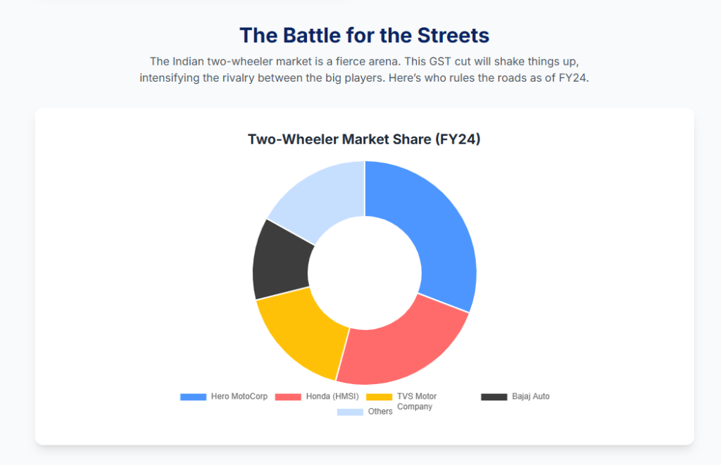 The Indian two-wheeler market is highly competitive, dominated by a few key players. The GST reduction is likely to shake up the existing market dynamics, particularly in the mass-market commuter segment. The following table illustrates the market share distribution among the top players in fiscal year 2024, providing a baseline for analysis of future shifts.25