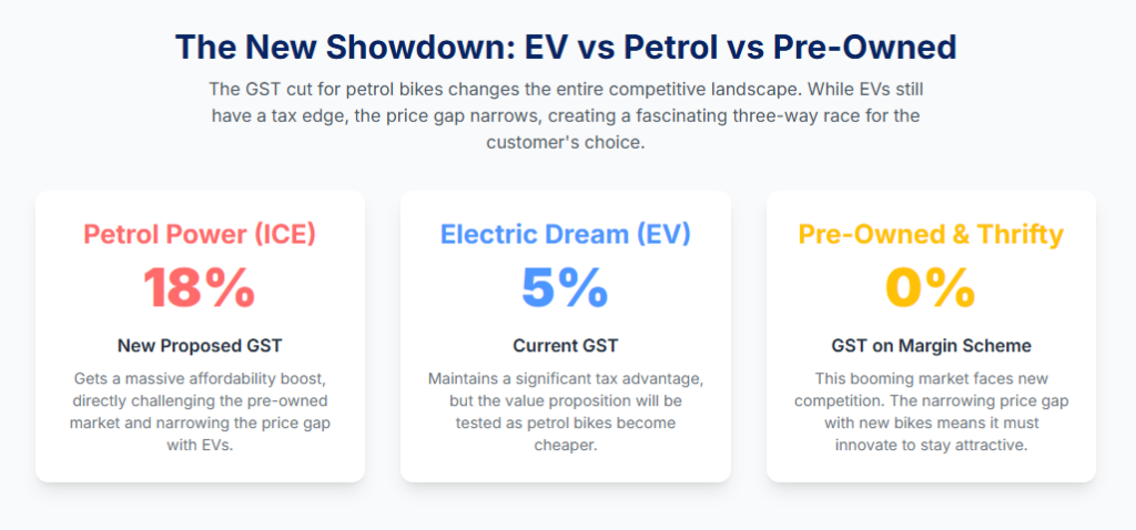 The challenging market conditions of the past few years, coupled with rising prices for new vehicles, have fueled a remarkable surge in the pre-owned and refurbished two-wheeler market.20 This segment has become a viable and trusted alternative for many consumers, especially in urban areas, driven by affordability and quality assurance.33 The proposed GST reduction on new bikes could directly challenge this growth. By narrowing the price gap between a new vehicle and a pre-owned one, the policy forces the pre-owned market to recalibrate its value proposition. Going forward, the new-bike market will be in direct competition with the used-bike segment, pushing both to innovate on pricing, warranties, and after-sales service to win over the price-sensitive buyer.