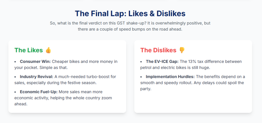 The proposed GST reduction for two-wheelers is a masterstroke of policy. It represents a triple win, creating a positive feedback loop for the consumer, the industry, and the government. For the consumer, it means lower prices, greater savings, and a newfound ability to retain more spending capacity. For the industry, it promises a much-needed sales revival, a boost to domestic demand, and a clear path to regaining market momentum after a difficult period. And for the government, this is a strategic move that, while reducing the per-unit tax, is expected to drive higher sales volume and compliance, leading to greater long-term revenue collection.