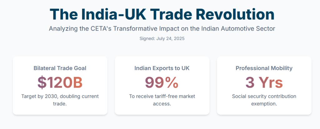 The recently signed Comprehensive Economic and Trade Agreement (CETA) between India and the United Kingdom marks a pivotal moment in their bilateral economic relationship. Formally inked on July 24, 2025, this agreement is designed to significantly expand two-way trade, with an ambitious joint goal of doubling bilateral trade from its current approximate $56 billion to $112 billion or even $120 billion by 2030.1 The automotive sector has been explicitly identified as a crucial contributor to achieving this ambitious growth target.3