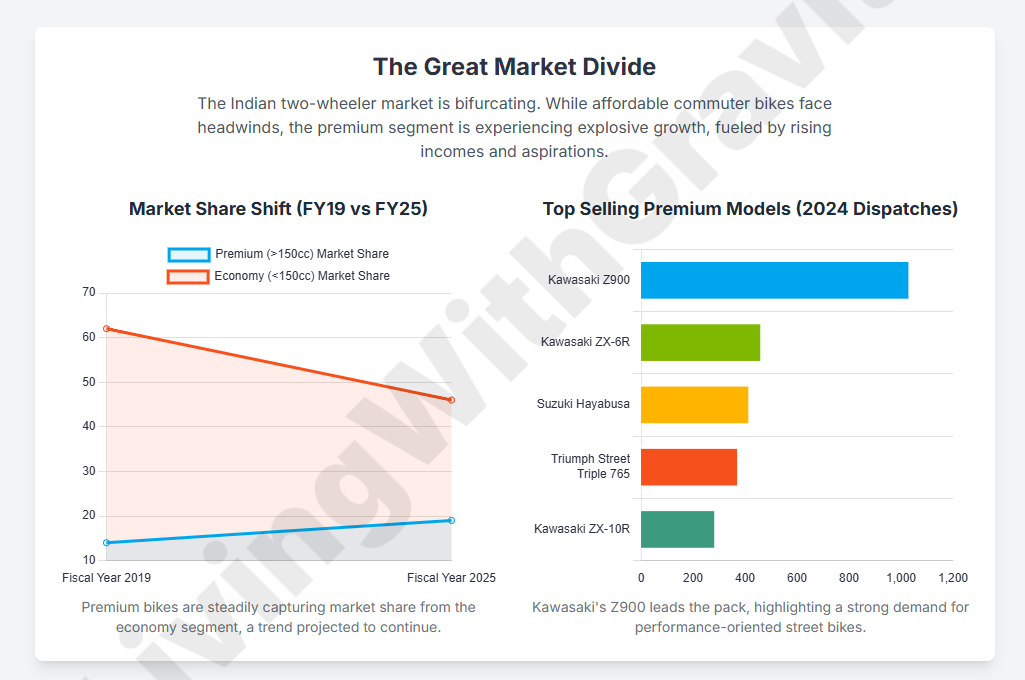 This section analyzes the quantitative shifts within the Indian two-wheeler market, highlighting the robust growth of the premium segment and its stark contrast with the declining economy segment.