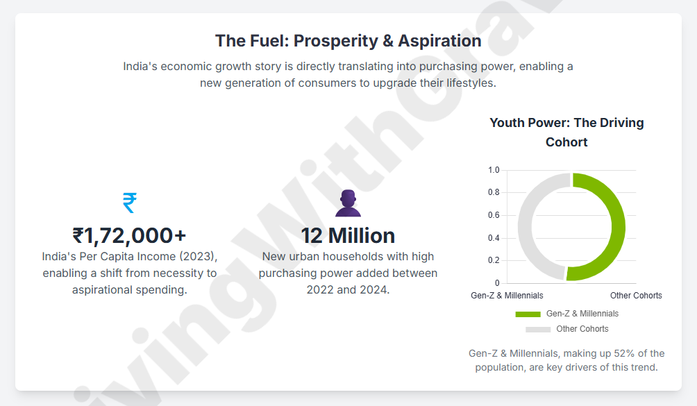 India’s per capita income has been consistently rising, reaching over INR 1,72,000 in 2023.11 This significant increase in disposable income is a primary driver, enabling consumers to shift from necessity-based purchases to aspirational consumption.2 Urban consumers, in particular, are showing a greater inclination towards higher spending on premium products.11 The growing affluence, particularly in Tier 1 and Tier 2 cities, contributes robustly to increased luxury spending across various categories, including automobiles.11 This trend is also fueled by a young, tech-savvy population and resilient private consumption.1