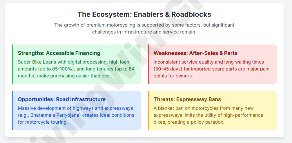 This section examines the external factors and support systems that influence the adoption and ownership experience of premium motorcycles in India.
