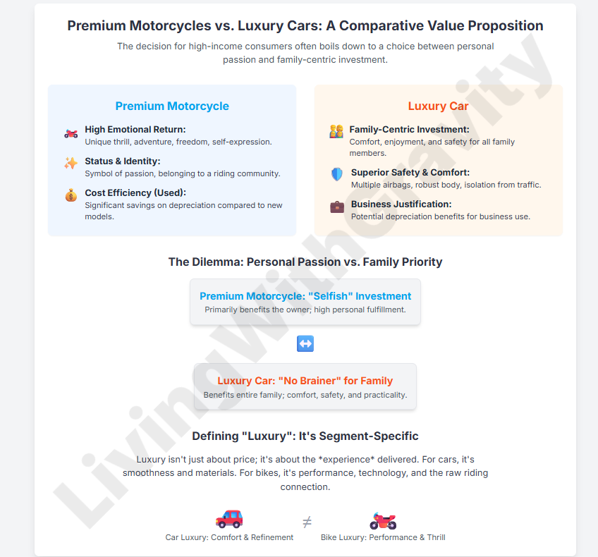 This section analyzes the decision-making process for high-income consumers, comparing the perceived benefits and trade-offs of investing in a premium motorcycle versus a luxury car in India.