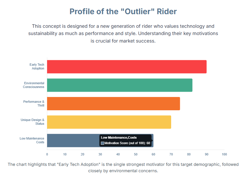 The true differentiator, however, is the wholesale commitment to the Software-Defined Vehicle paradigm through the ASIMO OS. This operating system transforms the motorcycle from a fixed mechanical product into an adaptive, personalized mobility device, leveraging concepts like Ultra-Personal Optimization to continuously enhance the riding experience. By aligning its aesthetic with cultural symbols of futuristic mobility (the Akira motif), Honda is successfully positioning the Outlier not merely as transportation, but as a technological and cultural icon designed to define the electric power cruiser segment of the 2030s. The feasibility of this vision hinges on successfully transitioning these advanced, high-cost control systems from the concept phase to mass production while maintaining a competitive balance of performance, safety, and price against single-motor architectures.
