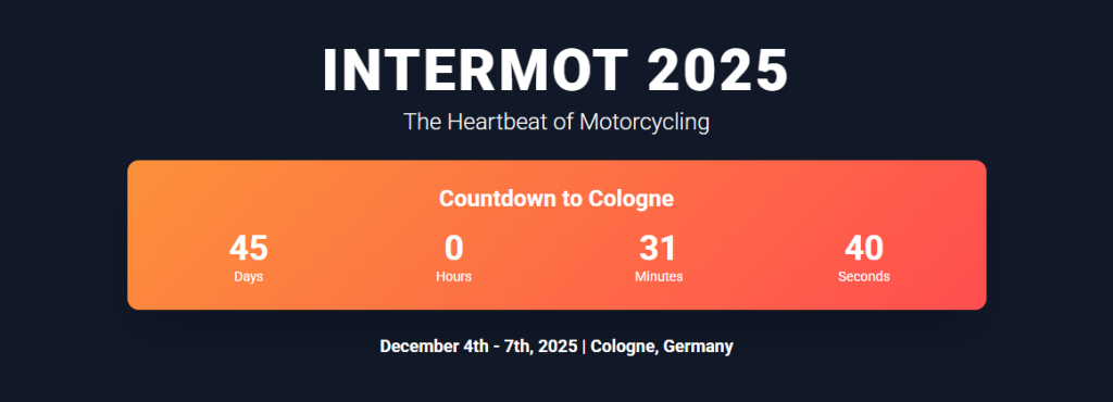 - INTERMOT 2025: Leading trade fair for the motorbike industry returns with a fresh concept, accessed on October 20, 2025, https://www.intermot-cologne.com/pressreleases/pm_0340_2025_1_EN(GB).xml?title=INTERMOT+2025%3A+Leading+trade+fair+for+the+motorbike+industry+returns+with+a+fresh+concept