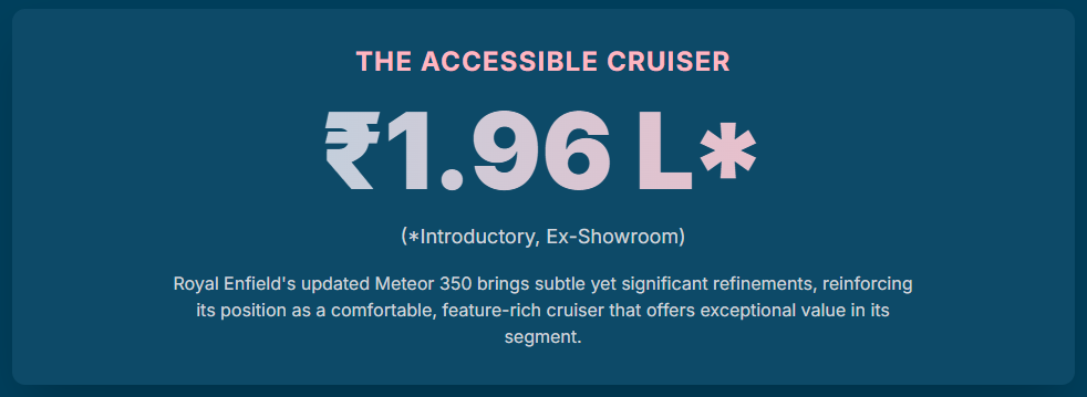 5. Royal Enfield launches all-new Meteor 350 line-up in India: Check features, price, booking date & more, accessed on September 17, 2025, https://m.economictimes.com/industry/auto/two-wheelers-three-wheelers/royal-enfield-launches-all-new-meteor-350-line-up-in-india-check-features-price-booking-date-more/articleshow/123897022.cms