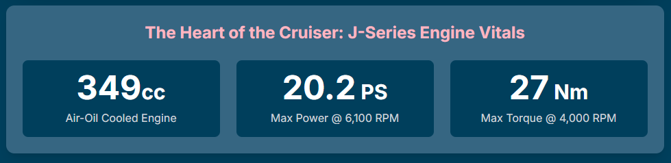 • Engine Performance: The Honda H’ness CB350, with its 348.36cc, air-cooled engine, produces a marginally higher power output of 20.7 hp and stronger peak torque of 30 Nm, compared to the Meteor’s 20.2 hp and 27 Nm.11 The Honda’s engine is tuned for a classic roadster character with a strong low-end pull, while the Meteor’s J-series engine is celebrated for its refinement and smooth, relaxed power delivery, a philosophical difference in engine tuning.11