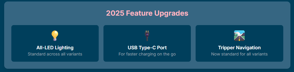 FeaturesLED lights, Tripper navigation, USB-C (standard)LED lights, traction control, hazard switch, USB charger (standard)LCD console, USB charger (accessory)