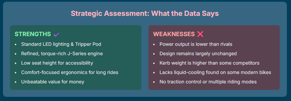 The motorcycle retains its core identity as a comfortable, accessible, and stylish machine for both city commuting and relaxed touring. Its primary strengths lie in the smooth and torquey J-series engine, a highly comfortable seating position, and its classic cruiser aesthetics. The introduction of a 7-year extended warranty is a significant value proposition, signaling a high degree of manufacturer confidence in the platform’s long-term reliability.