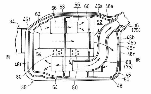 The muffler 35 includes an inner case 46 in which an expansion chamber EC is formed, an outer case 48 that covers the inner case 46.