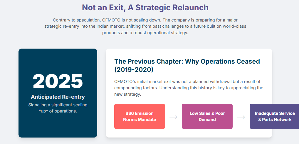 CFMOTO is unequivocally not discontinuing its existing models or scaling down operations in India. On the contrary, the company is actively preparing for a significant strategic re-entry into the Indian market by mid-2025, signaling a clear intent to scale up its presence and operations.