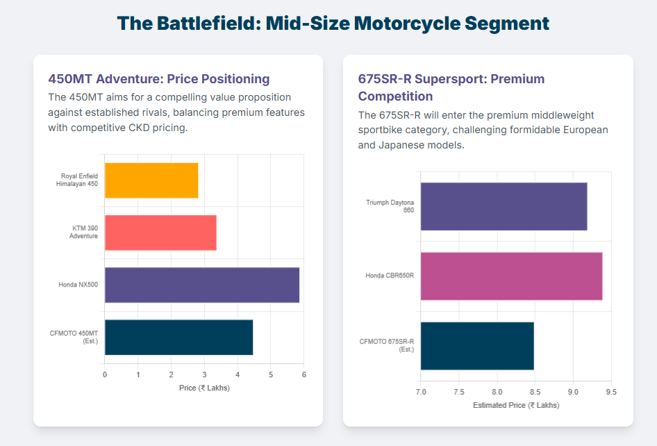CFMOTO’s re-entry is characterized by a highly targeted product strategy, focusing on globally successful models with premium specifications like the 450MT and 675SR-R. This approach represents a strategic evolution from their previous, less successful, broader product offerings. The objective is to leverage the rising popularity of the mid-size and adventure motorcycle segments in India.1 The emphasis on multi-cylinder bikes aligns with the evolving preferences of Indian consumers, who are increasingly seeking more powerful and refined motorcycles. This trend is so pronounced that Indian manufacturers are being encouraged to introduce twin-cylinder bikes to remain competitive.15 This shift in product focus demonstrates a deliberate, data-informed strategy for expanding their market presence.