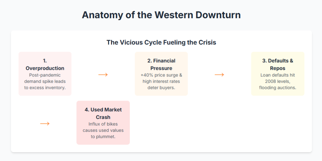 This disparity between inflated inventory levels and declining consumer demand has created immense financial pressure across the industry. In the United States, tens of thousands of new motorcycles are reportedly sitting unsold in dealerships, some for nearly a year.2 Despite aggressive promotional efforts, including discounts and zero-down financing, these bikes are not moving.2 This situation has led to an “eerie calm” in dealerships, with significantly reduced foot traffic (down nearly 40% year-on-year) and online inquiries (halved).2