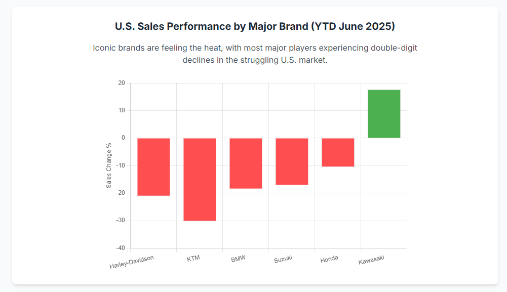 This decline has reshaped the competitive landscape. Kawasaki has notably overtaken Honda as the market leader in the U.S., with sales improving by a substantial 17.7% year-on-year. In contrast, Honda lost its leadership position, experiencing a 10.5% decrease in sales.1 The American icon, Harley-Davidson, appears to be a significant victim of the new economic wave, recording a deep 21.1% loss in sales. Other brands like KTM (-30.2%), Suzuki (-17.1%), and BMW (-18.5%) also faced substantial declines.1