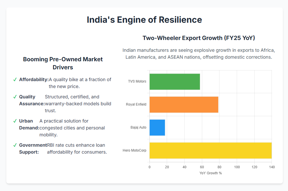 In stark contrast, emerging markets such as India demonstrate considerable resilience. This is evidenced by robust export growth, particularly to Africa, Latin America, and ASEAN nations 8, a booming pre-owned and refurbished segment 9, and domestic retail sales that show an upward trend despite some wholesale corrections.10 Supportive government policies, including Reserve Bank of India (RBI) rate cuts designed to enhance loan affordability 12, and various incentives promoting electric vehicle (EV) adoption, are playing a crucial role in mitigating some of the broader market challenges.13