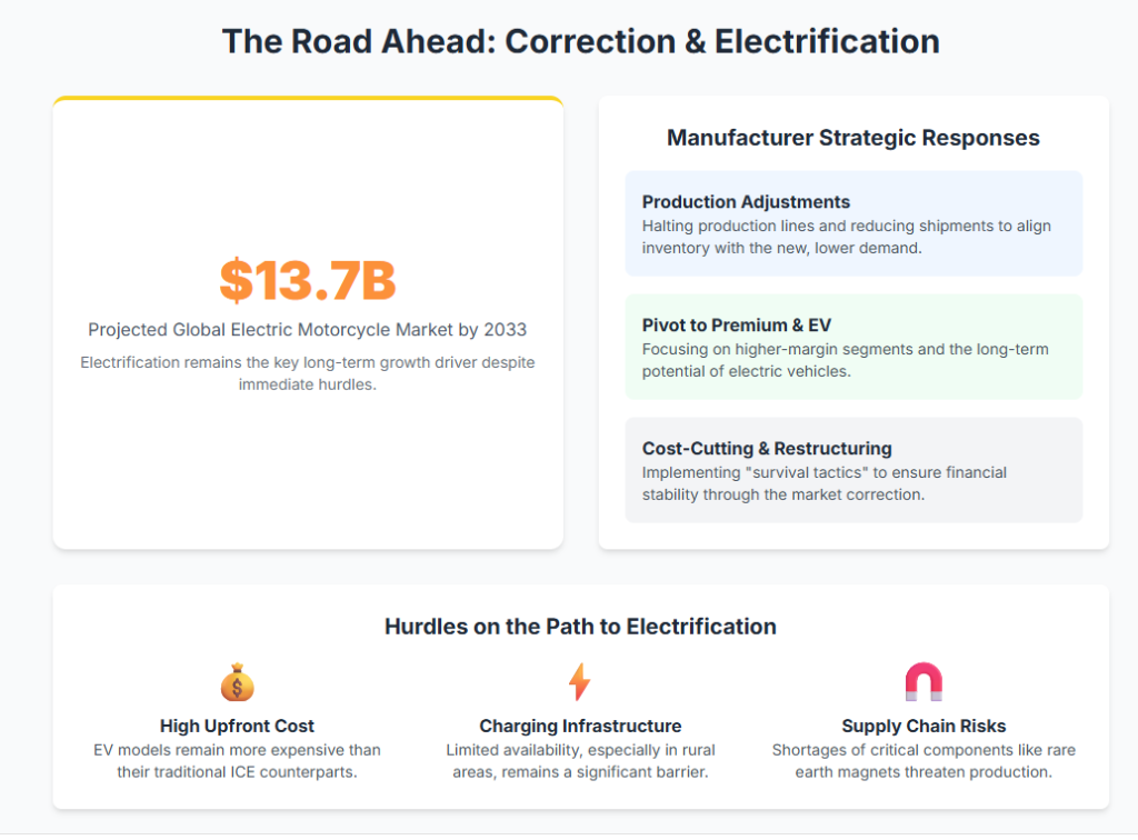 The accelerating shift towards electrification remains a powerful long-term growth driver across the industry. However, this transition faces immediate headwinds from supply chain vulnerabilities, most notably a critical shortage of rare earth magnets, which are essential for EV production.11 In response to these diverse market conditions, manufacturers are actively recalibrating their strategies. This involves significant production adjustments, aggressive cost-cutting measures, and a strategic diversification into premium and electric motorcycle segments. The prevailing sentiment indicates that the industry is undergoing a “once-in-a-generation correction” 2, which necessitates leaner operations, a more cautious approach to pricing, and a fundamental reassessment of production volumes to adapt to the evolving demand landscape.