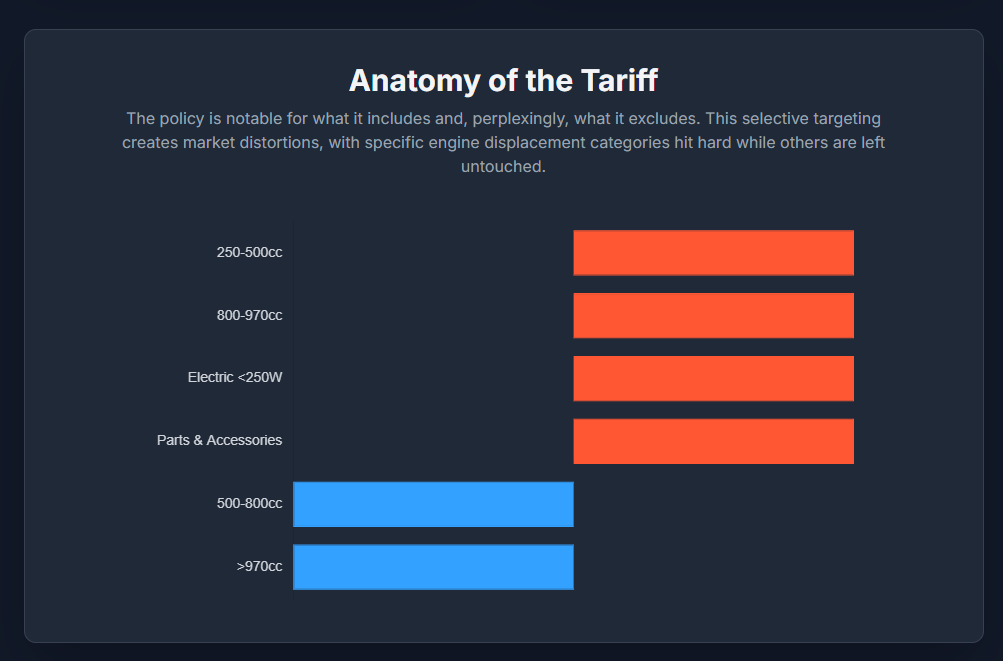 Despite this targeted approach, the policy contains a curious and illogical set of exemptions. An analysis of the HTS codes reveals “holes in this tariff strategy that are big enough to ride a midsize motorcycle through”.2 The policy inexplicably excludes two popular and significant segments of the market: bikes between 500 cc and 800 cc (HTS code 8711.40) and liter-class motorcycles (bikes exceeding 970 cc).2