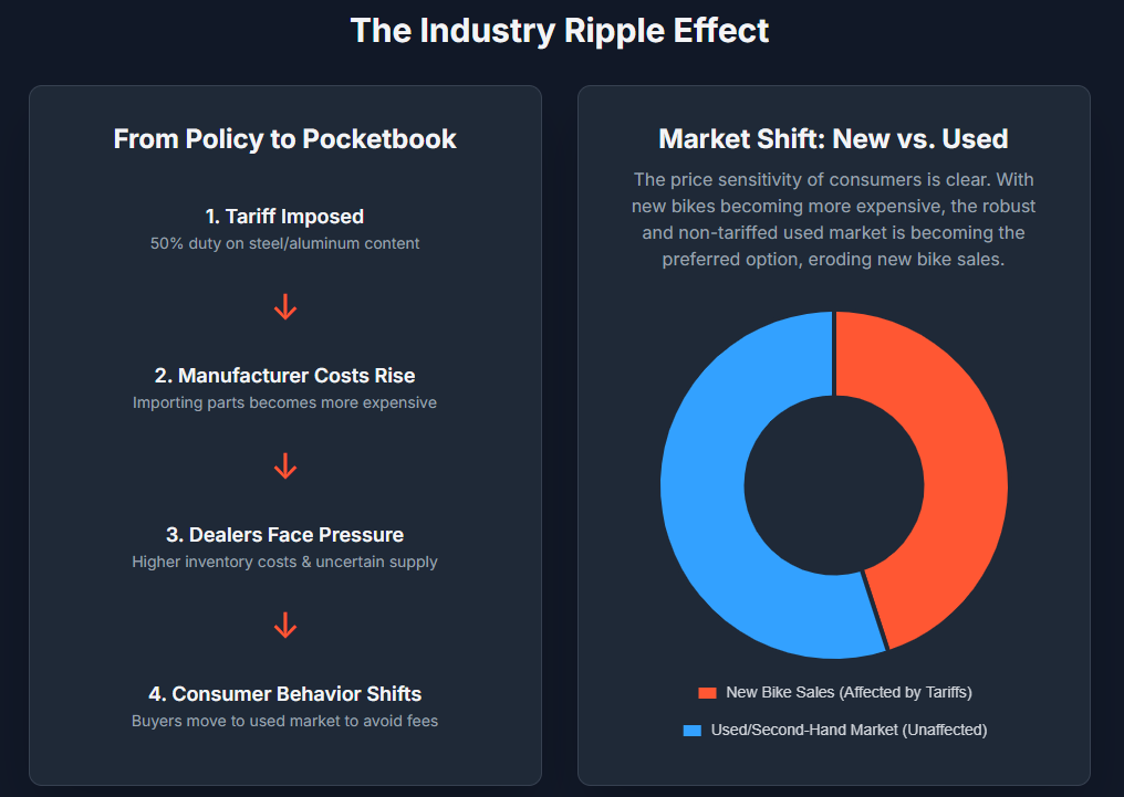 The new “derivative” tariffs represent a complex and significant disruption to the motorcycle industry. While the policy’s stated intention is to protect domestic manufacturing, its ambiguous nature and self-defeating outcomes are causing more harm than good. The evidence suggests that instead of fostering growth, the tariffs are amplifying existing market vulnerabilities, suppressing demand, and actively encouraging a shift away from new vehicle purchases. The very companies the policy was meant to protect are now grappling with internal financial strain and logistical chaos.