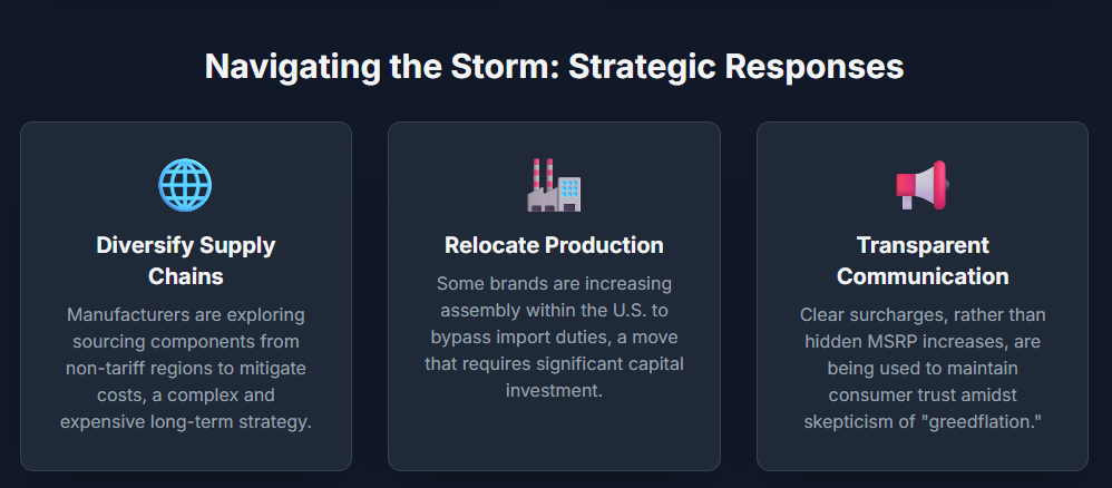 To navigate this turbulent environment, manufacturers must adopt proactive, long-term strategies. First, accelerating supply chain diversification is paramount. Companies should explore alternative sourcing options in regions with more favorable trade agreements or invest in domestic suppliers to reduce their dependence on tariff-affected countries.17 While a significant capital investment, expanding or leveraging U.S.-based manufacturing can provide a crucial pricing and supply advantage, as demonstrated by the strategies of Harley-Davidson and Honda.16 Lastly, transparent communication with both dealers and consumers is essential. Rather than simply raising the Manufacturer’s Suggested Retail Price (MSRP), brands should use clear surcharges with detailed explanations to help combat the perception of “greedflation” and maintain consumer trust.9