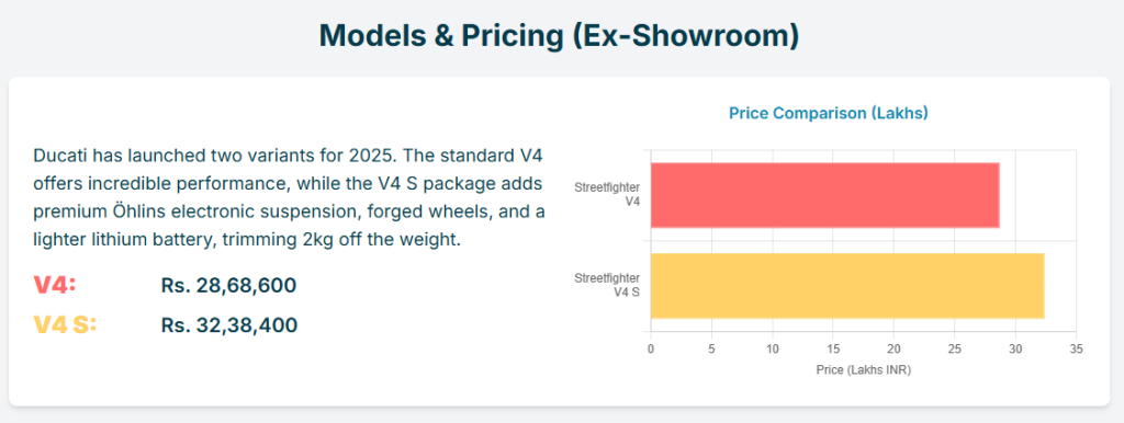 The 2025 range is introduced in two primary variants, with official ex-showroom pricing establishing the motorcycle at the absolute apex of the hyper-naked category in India. The standard Streetfighter V4 is offered in Ducati Red at an ex-showroom price of Rs 28,68,600. The higher-specification Streetfighter V4 S, also in Ducati Red, carries an ex-showroom price of Rs 32,38,400 .