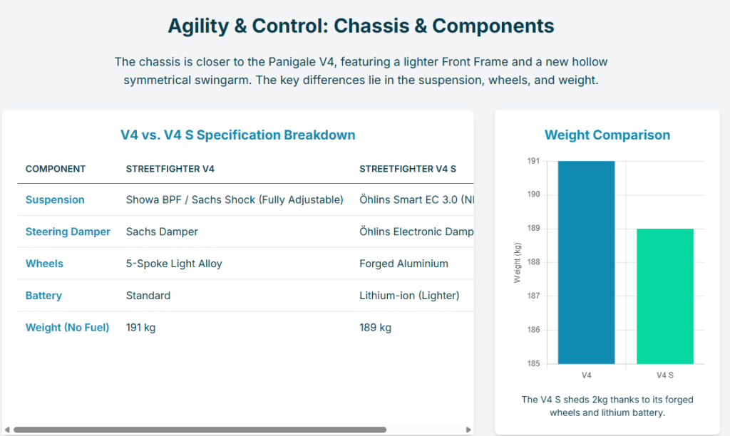 The differentiation between the standard V4 and the premium V4 S is based entirely on the complexity of the chassis components and the reduction of mass.