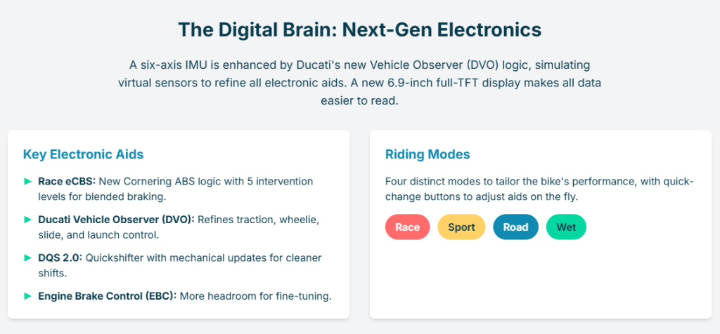 The foundation of the new electronic suite is the six-axis Inertial Measurement Unit (IMU), supplemented by Ducati’s revolutionary Vehicle Observer (DVO) logic . The DVO is an advanced algorithm, refined by Ducati Corse, designed to make the electronic controls predictive rather than purely reactive.13