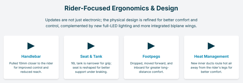 The fuel tank has a 16-liter capacity and is narrowed where the rider’s knees grip, working in conjunction with a reshaped seat designed to provide better support under heavy braking and during high-G cornering . This improved “knee grip” is vital for the rider’s sense of security and stability when managing the bike’s high cornering forces.17