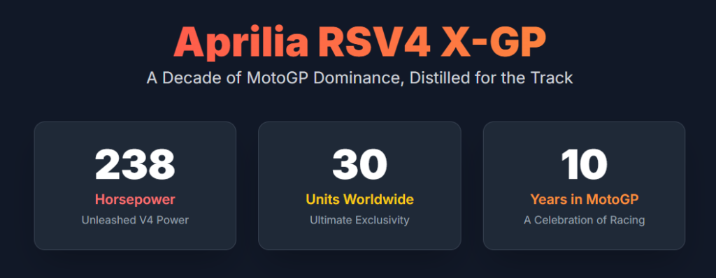 - Aprilia RSV4 X-GP provides MotoGP tech for just 30 lucky riders | Visordown, accessed on September 6, 2025, https://www.visordown.com/news/aprilia-rsv4-x-gp-provides-motogp-tech-just-30-lucky-riders