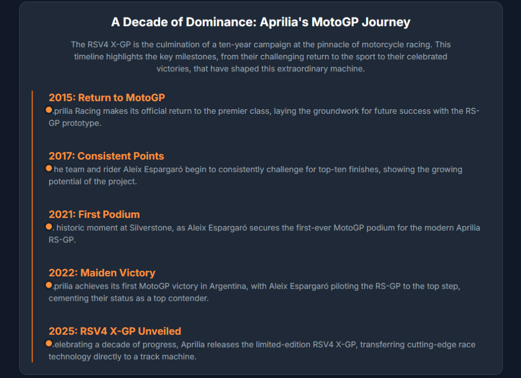 - Aprilia Racing presents the RSV4 X-GP, a limited edition of 30 units to celebrate the 10th anniversary of the RS-GP’s debut in MotoGP., accessed on September 6, 2025, https://www.paddock-gp.com/en/Aprilia-Racing-presents-the-RSV4-X-GP–a-limited-edition-of-30-units-to-celebrate-the-10th-anniversary-of-the-RS-GP%27s-debut-in-MotoGP./