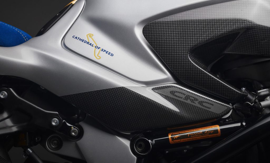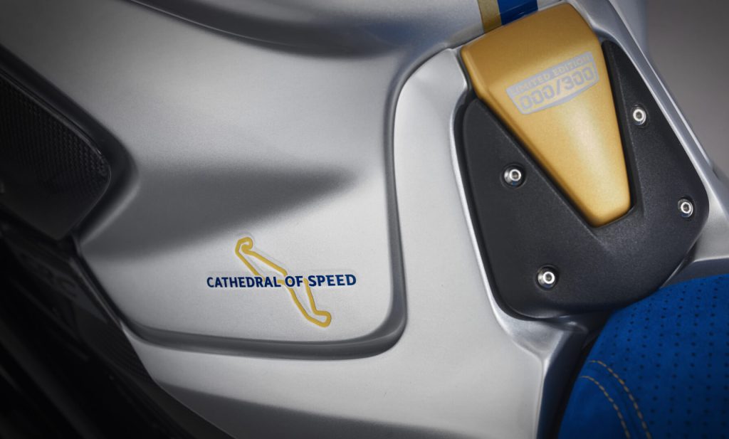 The motorcycle is immediately recognizable by its unique color scheme on a blue and silver base, named Blu Nordico and Argento Ago.1 This palette of cool, metallic colors stands in elegant contrast to the traditional red associated with Italian sportbikes, conveying a message of “fresh northern winds and strong seas”.17 Gold accents further enhance the livery, perfectly complementing the blue and silver base.4 The seat is finished with a luxurious blue Alcantara upholstery, adding a touch of prestige and exclusivity.4
