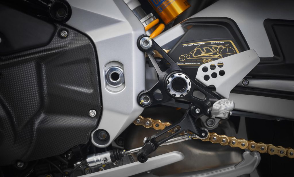 The Brutale Assen is built on a “CrMo Steel tubular trellis” frame complemented by adjustable rear swingarm pivot plates made from aluminum alloy.10 The bike’s suspension system is equally advanced, featuring electronically controlled Öhlins Smart EC 2.0 components at both ends.9 Up front, the